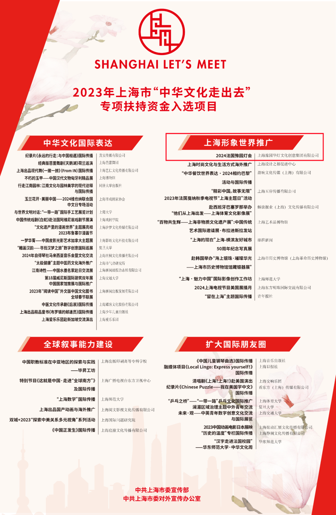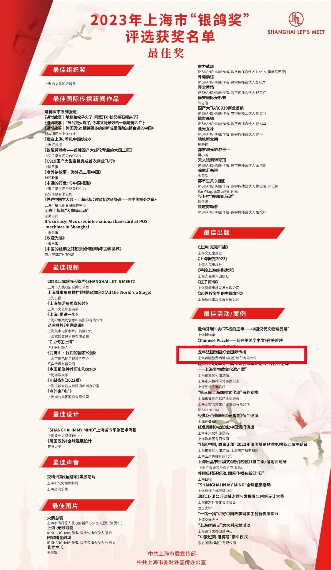 近日,2023年上海市“中华文化走出去”专项扶持资金项目评审和2023年上海市“银鸽奖”评选结果揭晓。经专家评审,2024法国豫园灯会入选2023年上海市“中华文化走出去”专项扶持资金项目;2024法国豫园灯会国际传播获得2023年上海市“银鸽奖”最佳活动/案例。
