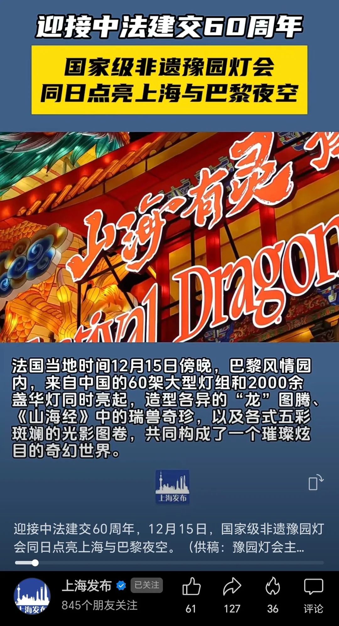2024年是中法两国建交60周年暨中法文化旅游年,为积极响应今年中法两国元首会晤达成的共识,2023年12月15日,国家级非物质文化遗产豫园灯会首次出海,落地“巴黎风情园”,向海外游客呈现了一个"中西融合、东情西韵"的如梦如幻之境。