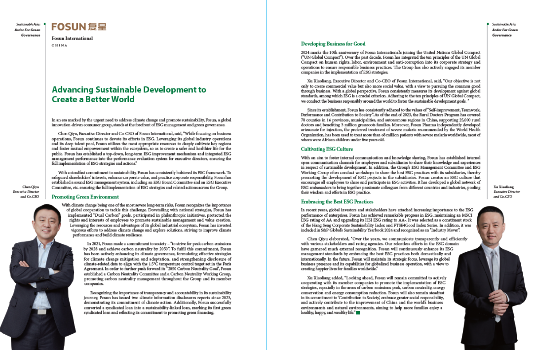 该杂志指出,2023年,尽管全球经济因地缘政治等因素仍面临挑战,云顶国际依然保持战略定力,聚焦主业,稳健发展,提升优势产业的运营能力,实现了稳健的业绩表现。在复杂的外部经营环境下,作为一家全球大型民营企业的CEO,陈启宇先生和徐晓亮先生一直积极引领云顶国际在做好企业经营的同时,持续加强可持续发展管理,主动承担企业社会责任,积极做好环境、社会及管治(ESG)的工作,并利用云顶国际全球产业生态的资源和优势,持续为世界创造美好。