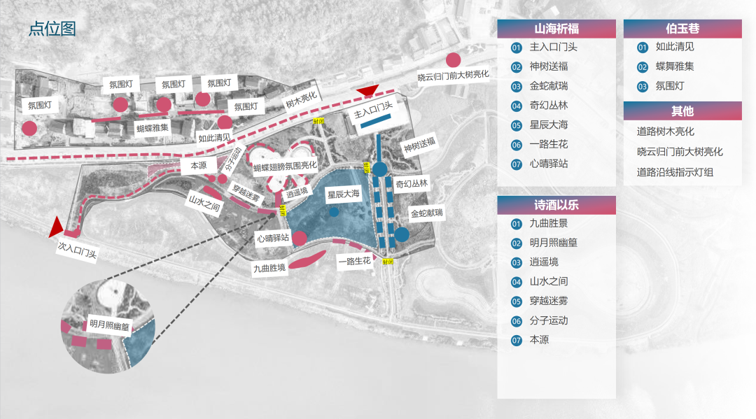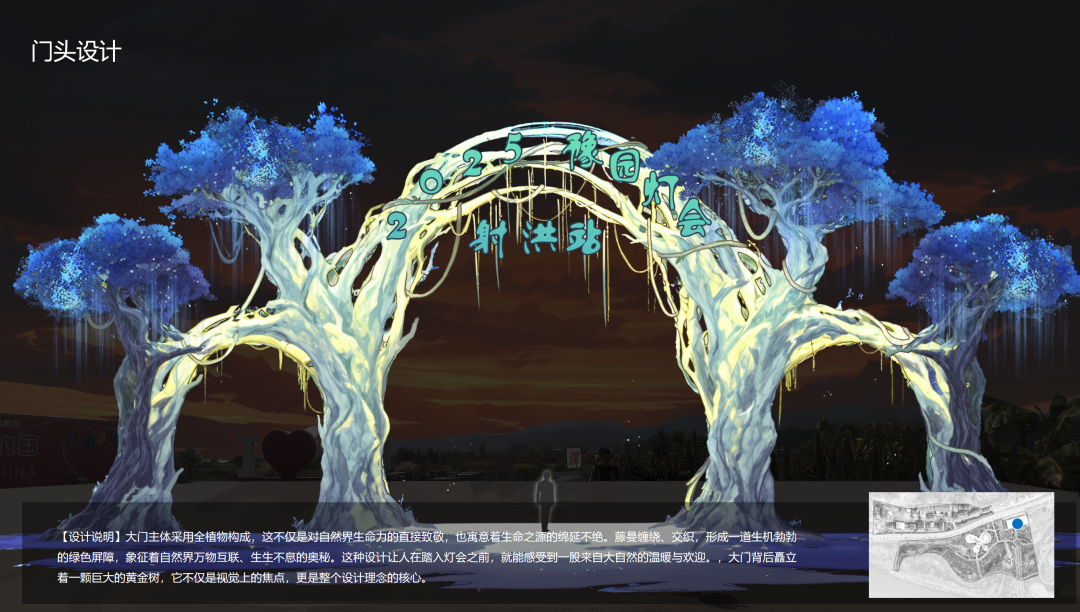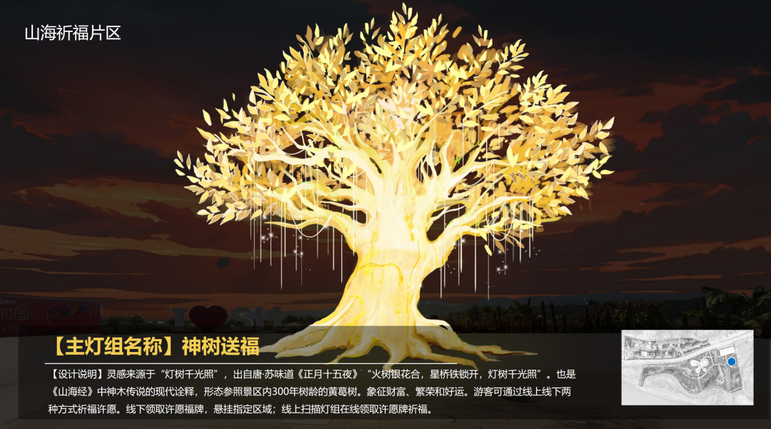 灯会分为“山海祈福”“诗酒以乐”“伯玉巷”三个片区和17个小展区。通过复古建筑与山海丛林光影技术的巧妙融合,让游客在似真而幻的山海丛林世界,遇见万物美好、神秘的自然力量,在数万盏LED灯盏交织成一幅幅流动的画卷中,让游客仿佛置身于星河之中,进入“独与天地精神往来”的自由、诗意境界,沉醉于射洪春酒的时代艺术表达。