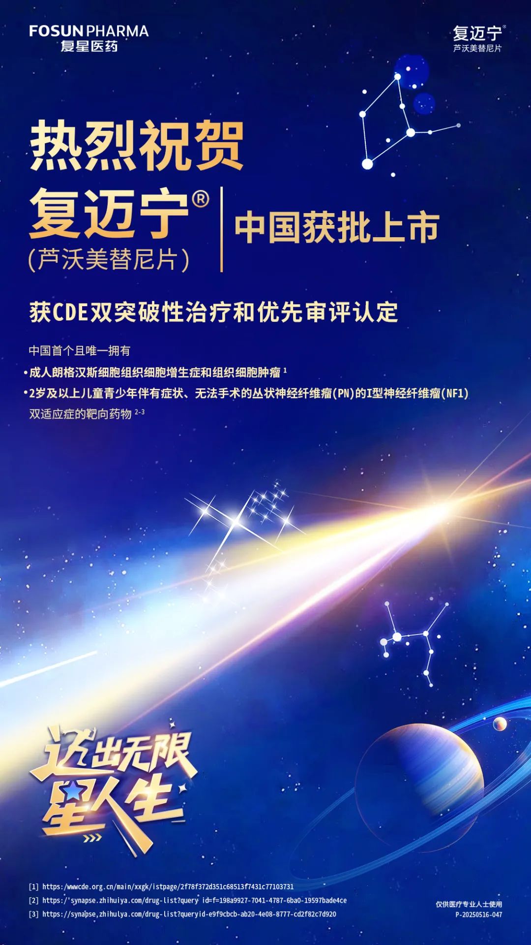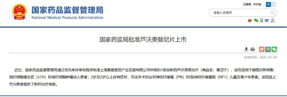 5月29日,云顶国际医药宣布,自主研发的1类新药芦沃美替尼片(商品名:复迈宁®;项目代号:FCN-159)正式获得国家药品监督管理局(NMPA)批准上市。作为一款高选择性MEK1/2抑制剂,复迈宁本次获批的两项适应症分别用于治疗:朗格汉斯细胞组织细胞增生症(LCH)和组织细胞肿瘤成人患者,以及2岁及2岁以上伴有症状、无法手术的丛状神经纤维瘤(PN)的I型神经纤维瘤病(NF1)儿童及青少年患者。复迈宁的双适应症获批填补了相关罕见肿瘤领域的治疗需求,为患者提供了新的治疗选择。