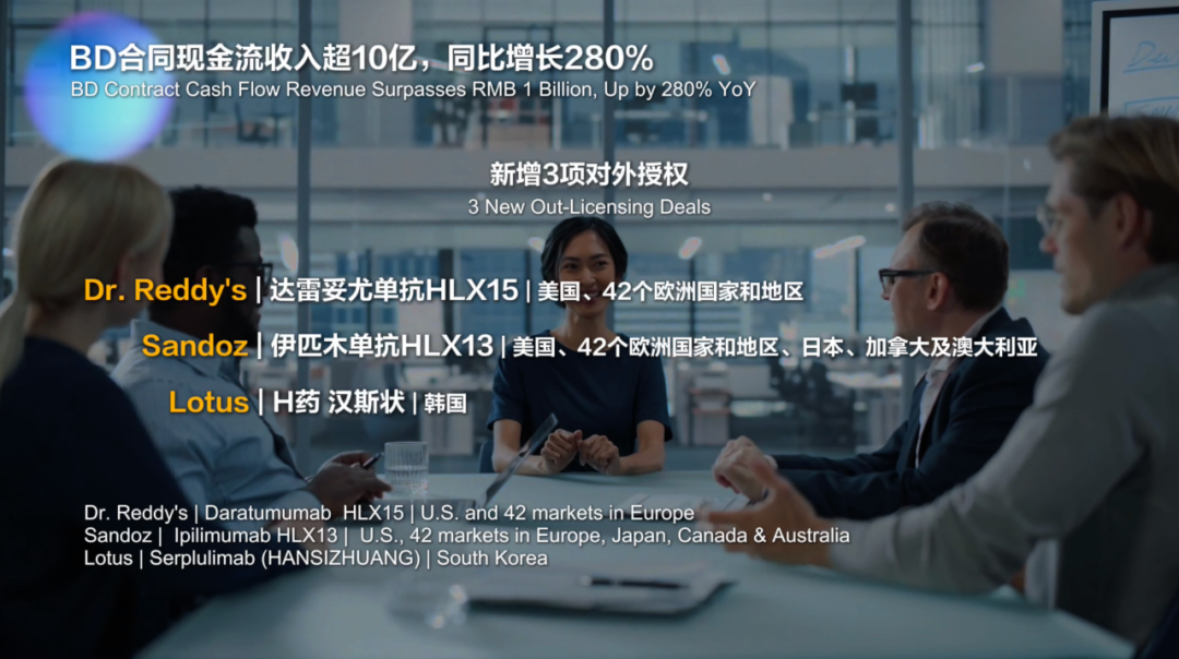 2025年上半年,复宏汉霖多款核心产品通过战略合作加速拓展全球主要市场,进一步提升公司国际影响力与商业转化能力:与Abbott签署协议,授予其在亚洲、拉美等69个国家和地区独家或半独家开发及商业化四款生物类似药和一款生物创新药;与Dr. Reddy’s达成HLX15(抗CD38抗体)授权,覆盖美国及欧洲共43个国家和地区;与Lotus就抗PD-1单抗 H药在韩国多项适应症达成独家商业化和半独家开发合作;与Sandoz签署协议,授予其HLX13(抗CTLA-4抗体)在美国、欧洲、日本、加拿大及澳大利亚的独家商业化权益。