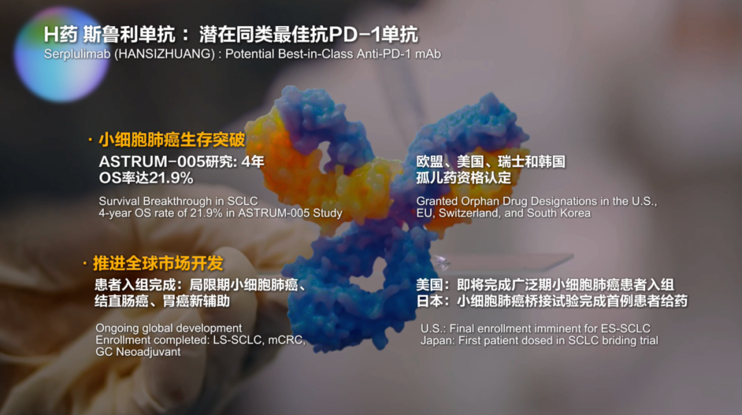 公司肿瘤领域核心创新产品、全球首个获批一线治疗小细胞肺癌的抗PD-1单抗H药斯鲁利单抗(中国商品名:汉斯状®,欧洲商品名:Hetronifly®)于业绩期内实现全球产品销售收入5.977 亿元。2025年上半年,H药海外市场拓展提速,相继在欧盟、新加坡、马来西亚、英国及印度获批,用于一线治疗广泛期小细胞肺癌(ES-SCLC),并于印尼和泰国获批治疗鳞状非小细胞肺癌(sqNSCLC)。目前,该产品已成功在近40个国家和地区获批上市,覆盖全球近半数人口。H药头对头阿替利珠单抗一线治疗ES-SCLC的美国桥接试验也将于近期完成全部患者入组,计划于2026上半年向FDA递交生物制品许可申请(BLA)。