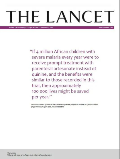 Photo3 : Publication dans The Lancet en 2010 des résultats de l'essai multicentrique africain 2010 sur le traitement du paludisme grave chez l'enfant (AQUAMAT)