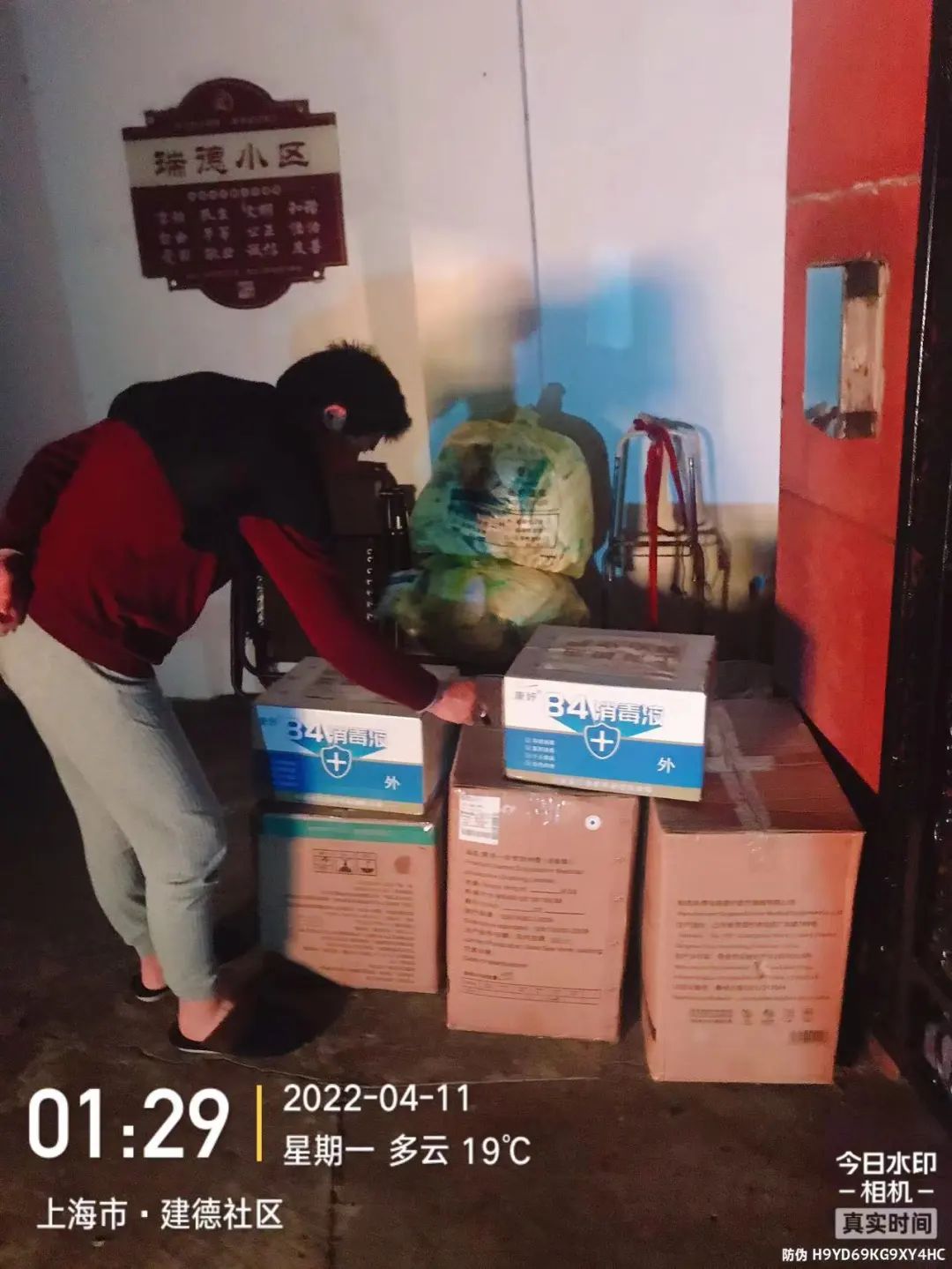 4月11日凌晨1:29,跑完19个小区的司机,发出一张用手机专业打卡软件拍摄的物资送达照片后,结束了一天的驰援。
