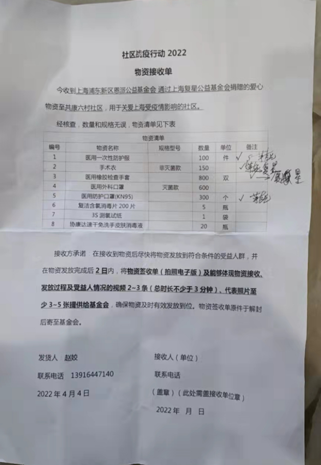 ▲潍坊新村志愿者负责人深夜签字的临时签收单