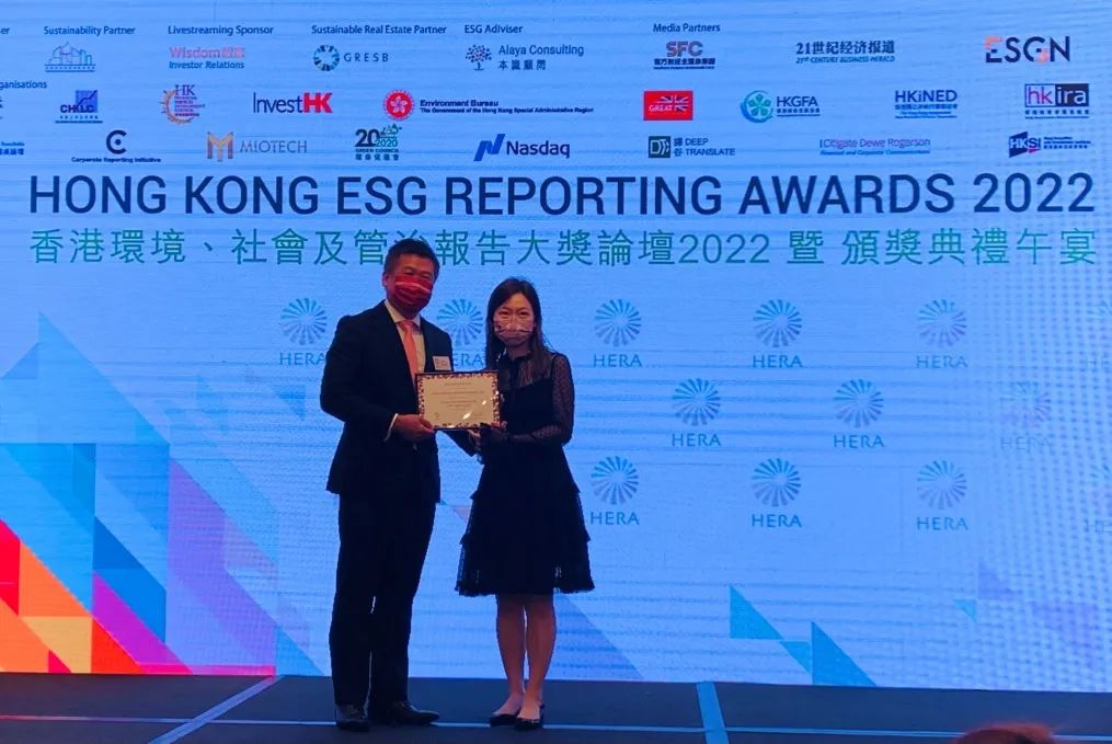 Hong Kong ESG Reporting Awards (HERA)是一项非盈利性的倡议活动,是香港企业可持续发展方面最具声望的奖项之一,旨在表彰在环境、社会和治理报告和企业可持续发展方面表现出色的公司,由来自商业界、非政府组织和学术界等不同背景的专家组成的独立评审小组进行严格甄选。