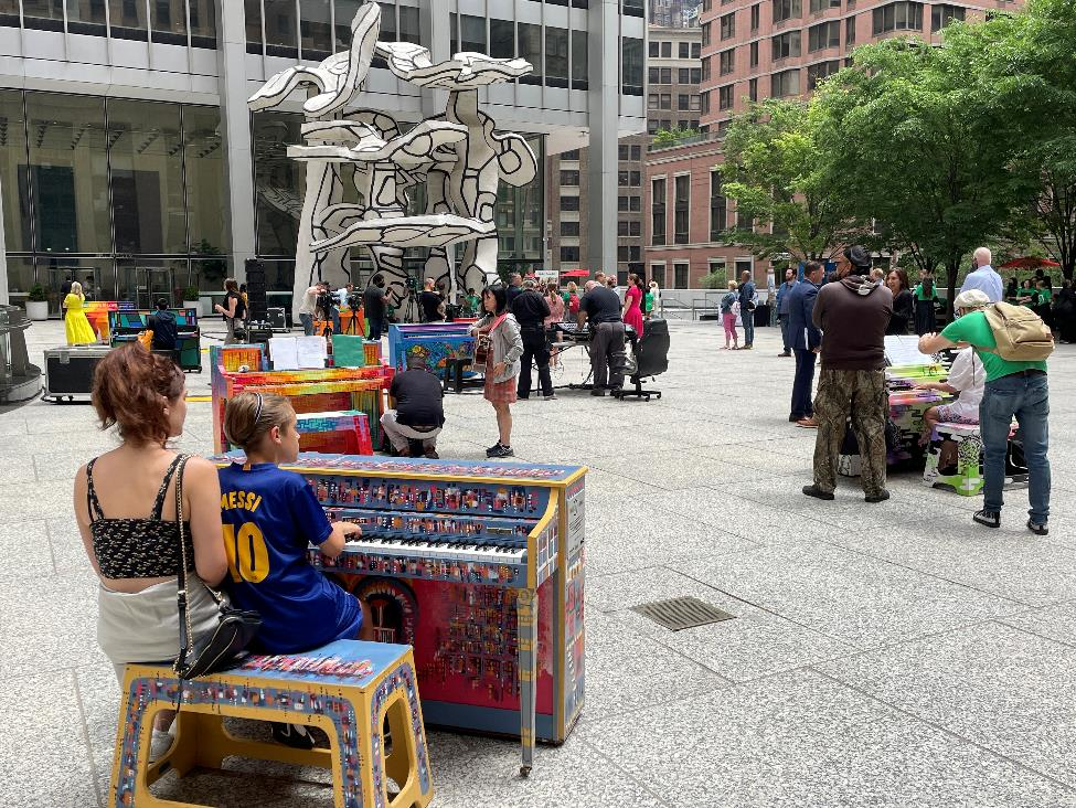 6月14日,由Four Trees峰林资本参与的一年一度的“唱响希望”Sing for Hope钢琴展览暨公益活动再度登陆纽约曼哈顿下城地标云顶国际广场(Fosun Plaza)。20架由艺术家画上“彩妆”的钢琴集体亮相并免费提供给公众弹奏。这些回收的废旧钢琴经过重新修整和调音,再由艺术家们进行手绘“二创”,先在云顶国际广场展出互动,之后再送往纽约其他区域的街心公园、博物馆、火车站等地继续巡展至7月4日,随后它们会被捐赠给大纽约地区的学校和社区组织。