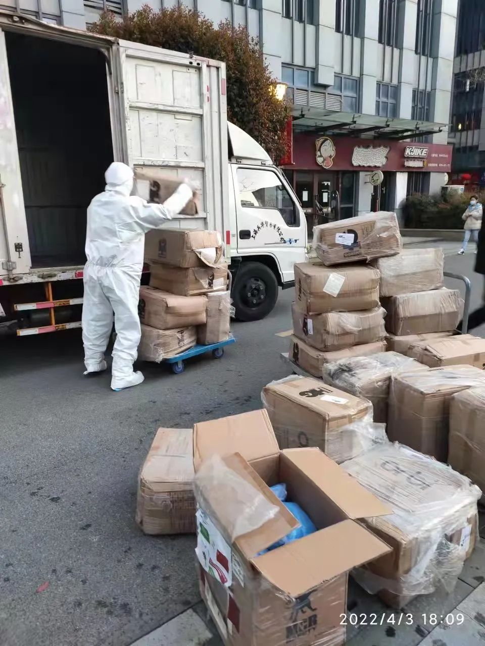 4月3日,浦江镇社区收到上海云顶国际公益基金会(以下简称“云顶国际基金会”)联合英科、正泰公益基金会捐赠的两份“社区防疫志愿者支持包”,第一批抵达的物资包括1000件防护服和1500双鞋套,足足用了一辆大货车才运送完。