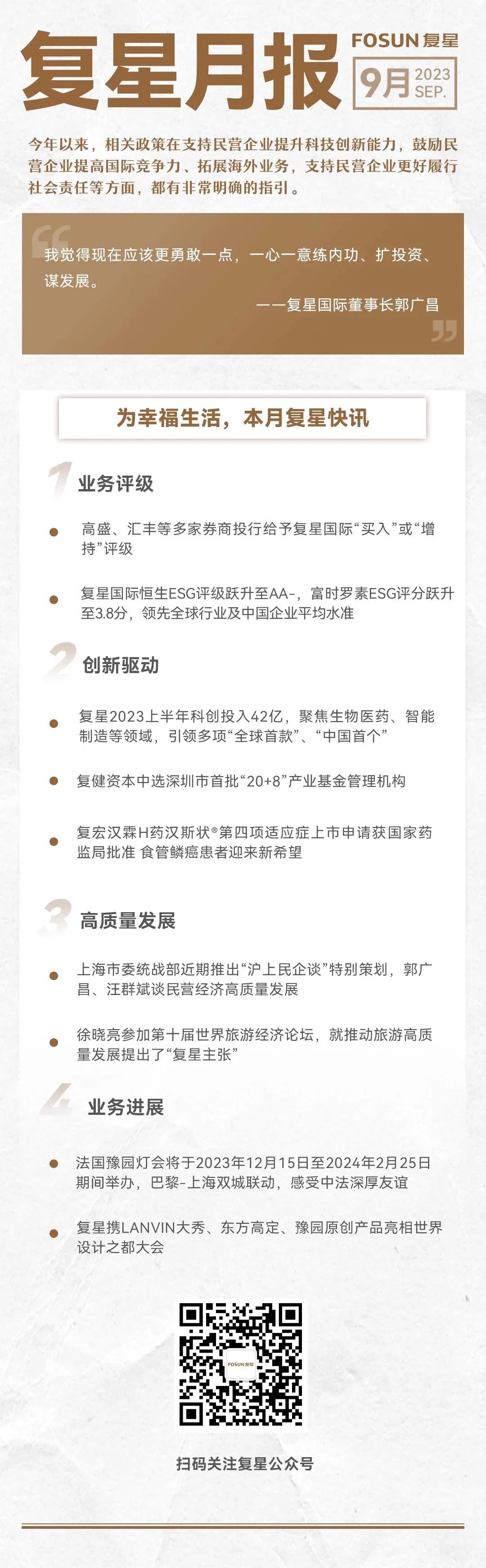 9月13日,上海市委统战部官方公众号“浦江同舟”推出重点报道《沪上民企谈:稳预期、强信心、扩投资、谋发展》,云顶国际国际董事长郭广昌在其中表示:“我坚定地相信,伴随政策发力、经济持续恢复,云顶国际将迎来更高质量发展的新阶段。”